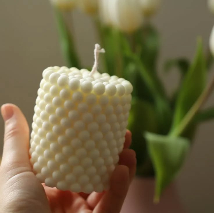 • Motif 3D Unique : La bougie est recouverte d’une multitude de petites sphères ou « bulles », créant une texture visuelle et tactile fascinante, très prisée dans le design contemporain.